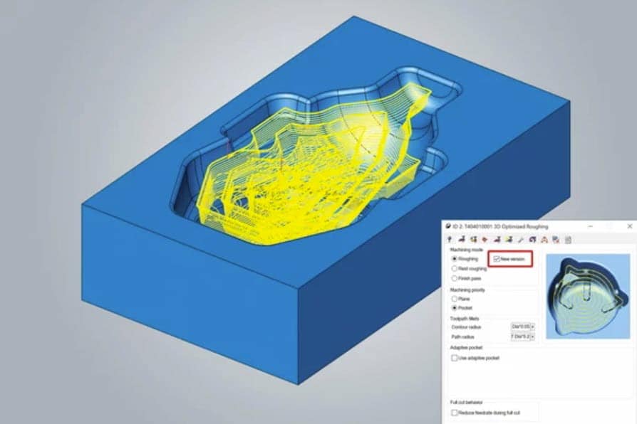 Algorytm frezowania kieszeni został przeprojektowany dla trybu obróbki zgrubnej strategii w celu osiągnięcia większej wydajności podczas obróbki zgrubnej i lepszej kontroli obróbki. Zalety nowej wersji są widoczne podczas obróbki z dużymi posuwami bocznymi i pozostałym materiałem. Dodatkowo można zdefiniować promień konturu i promień ścieżki, co pozwala na lepszą kontrolę zaokrągleń ścieżki narzędzia. Promień konturu jest używany dla ścieżek narzędzia wzdłuż geometrii modelu, natomiast promień ścieżki jest używany dla wszystkich innych ścieżek przesunięcia.