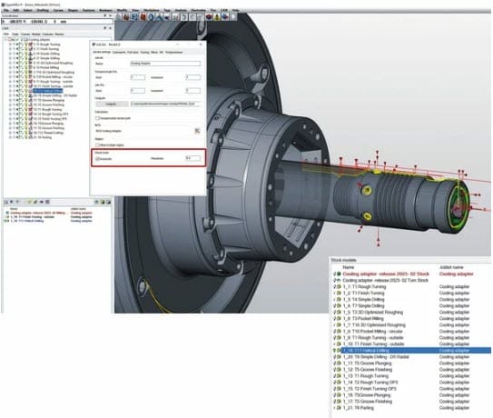 Nowa wersja oferuje całkowicie nowy system obsługi półfabrykatów w hyperMILL®. Jest on w pełni automatyczny, wydajny, inteligentny i ma zastosowanie we wszystkich rodzajach obróbki, od wiercenia, toczenia i frezowania po obróbkę addytywną. Po aktywowaniu opcji „Automatycznie utwórz łańcuch półfabrykatów” na liście zadań w ramach definicji rozdzielczości, hyperMILL® automatycznie tworzy wszystkie modele półfabrykatów w odpowiedniej kolejności. W przypadku usunięcia lub zmiany kolejności zadania obróbki hyperMILL® odpowiednio dostosowuje łańcuch półfabrykatów. Podobnie, w razie potrzeby zadanie obróbki można usunąć z łańcucha półfabrykatów. W przeciwnym razie nie jest wymagana żadna interakcja użytkownika, a hyperMILL® obsługuje wszystkie modele półfabrykatów, od utworzenia do przekazania do symulacji lub maszyny wirtualnej.