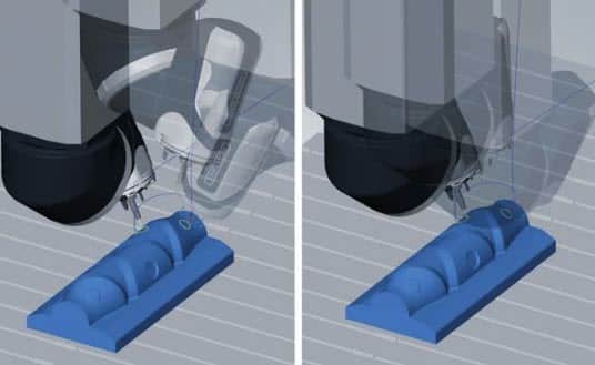 Dzięki nowej opcji „Użyj VM do obliczeń” hyperMILL® wykorzystuje model maszyny bezpośrednio podczas obliczania ścieżki narzędzia. Kontrola kolizji i ich unikanie odbywa się z uwzględnieniem geometrii i ograniczeń maszyny. Rezultat: bardziej precyzyjne i zoptymalizowane ścieżki narzędzia, zwłaszcza w ciasnych przestrzeniach lub gdy głowica maszyny pracuje blisko części lub ograniczeń maszyny. Obszary pozostałego materiału, które powstają w wyniku kolizji lub ograniczeń maszyny, można ponownie obrabiać w zwykły sposób przy użyciu innych strategii i bez widocznego przejścia dzięki opcji „Płynne zachodzenie”.