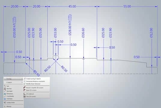 W prosty i zautomatyzowany sposób można utworzyć specjalny szkic V do obróbki. Na podstawie modelu 3D, który zazwyczaj jest projektowany z wymiarami nominalnymi, szkic V z konturem obróbki jest generowany niemal całkowicie automatycznie. Za pomocą polecenia można zdefiniować wymiary poziome i przypisać odpowiednie specyfikacje tolerancji. Na podstawie tych wartości kontur obróbki można przesunąć do środka tolerancji. Dzięki nowemu szkicowi V do toczenia można również szybko i efektywnie przygotować kontur toczenia z podcięciami, załamaniami krawędzi i tolerancjami do programowania.
