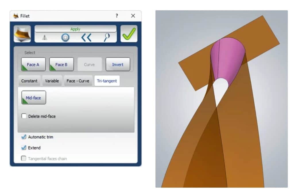 Dzięki hyperMILL® można teraz tworzyć płynne zaokrąglenia między trzema sąsiadującymi powierzchniami, zachowując pełną ciągłość. Funkcja ta pozwala zaoszczędzić cenny czas podczas modelowania złożonych geometrii, takich jak łopatki turbin, zapewniając jednocześnie najwyższą precyzję i jakość modeli.
